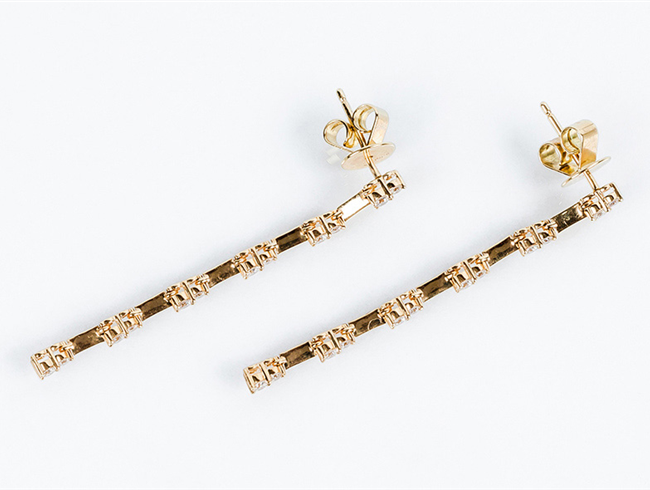 Pendientes largos en oro amarillo 18 K, en fila articulada con pares de limpios y blancos diamantes, talla brillante (24 bts: 0.52 ct aprox. Características estimadas: color G, pureza VS). Sistema de presión. 42 mm. A estrenar.