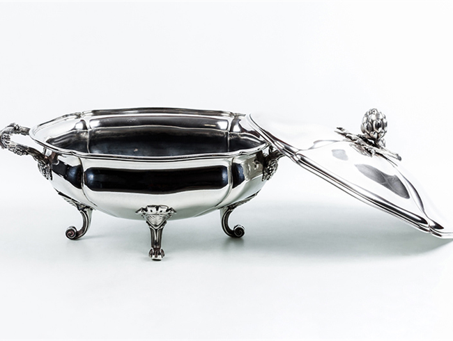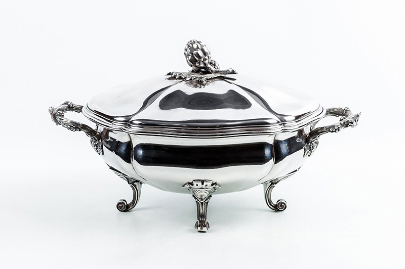 Espléndida sopera antigua (s.XIX), realizada por el maestro platero madrileño Antonio Martínez en plata maciza 916 mil, contrastada, de cuerpo oval lobulado, con cuatro patas con forma de roleos. Asas decoradas con vides y racimos de uvas, y detalle de bellotas coronando la tapa. C 1848. 40 x 22 cm. [Antonio Martínez fue un conocido orfebre, activo entre 1840 y 1890. Trabajó para la Real Fábrica de Platería, que producía piezas de lujo para la burguesía y la corte]