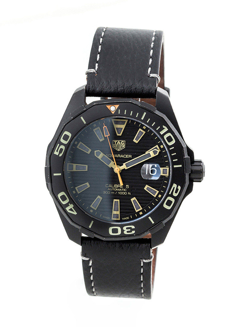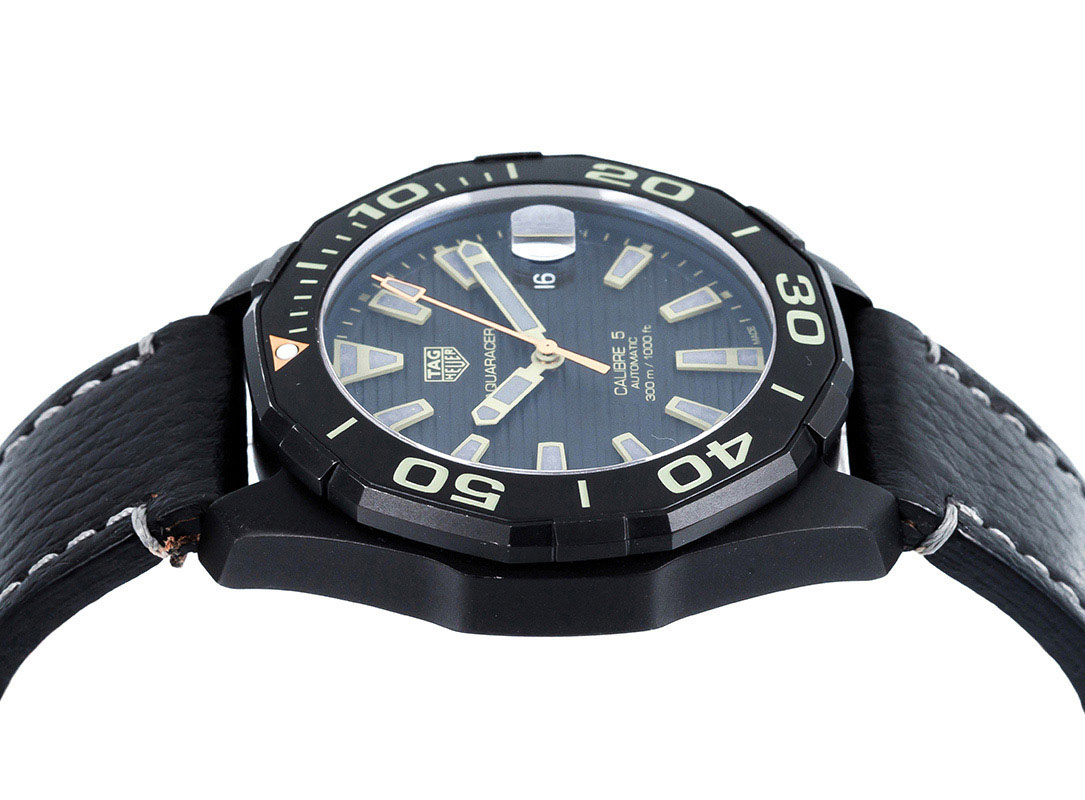 Reloj submarino cab., suizo, TAG HEUER Aquaracer 'Night Diver', Calibre 5, Automatic, 300 m,. Ref WAY208C.FC6383. En caja con bisel giratorio unidireccional en cerámica negra, 43 mm, con recubrimiento DLC en negro mate. Corona roscada con protectores. Movimiento automático, 25-26 rubíes, 28.800 alternancias/h, reserva de marcha ˜ 38-42 h. Esfera grafito en franjas horizontales con baquetones y agujas luminiscentes. Calendario a las tres, segundero central. Brazalete de piel negro. Excelente condición (0-1). Estado de marcha. Se acompaña de brazalete original impermeable, forrado en piel, con su cierre desplegable. Tarjeta de Garantía (Marzo 2017).