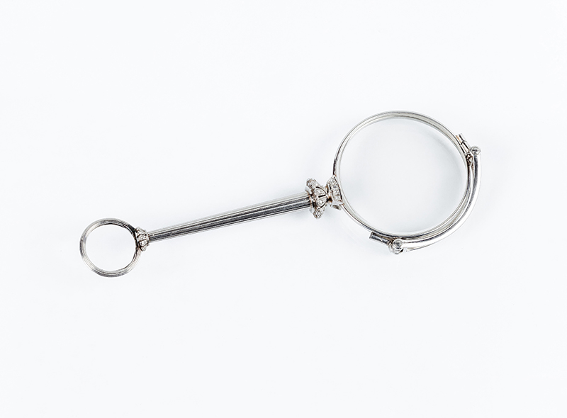 Delicados anteojos de ópera en platino y diamantes con mecanismo de apertura automática. Decoración estriada. Finales s. XIX - ppios. S. XX. 10,0 cm.