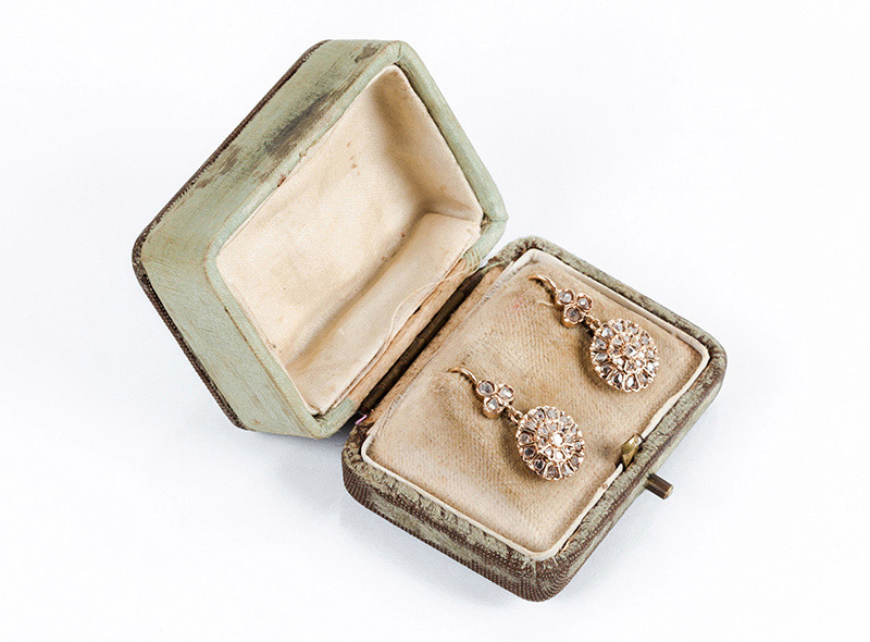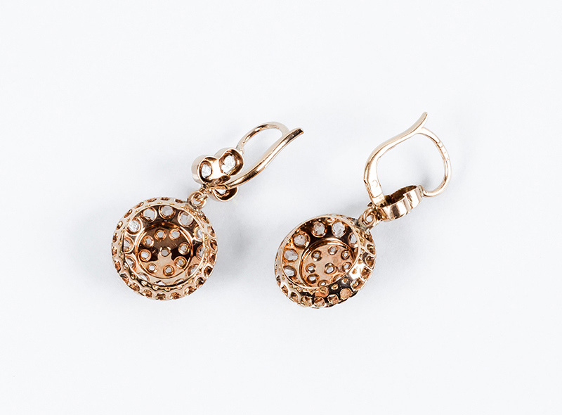 Pendientes antiguos en oro rosa 18 K, con un rosetón cuajado de diamantes, talla simple, colgante de motivo en trébol con diamantes (48 dts: 1.00 ct aprox). Sistema de zarcillo con muelle. 25 x 14 mm. Con estuche antiguo.