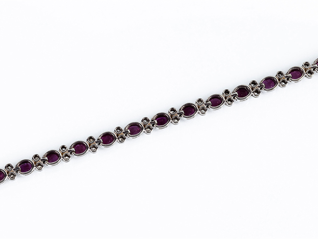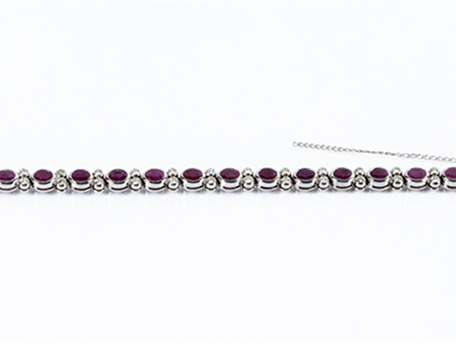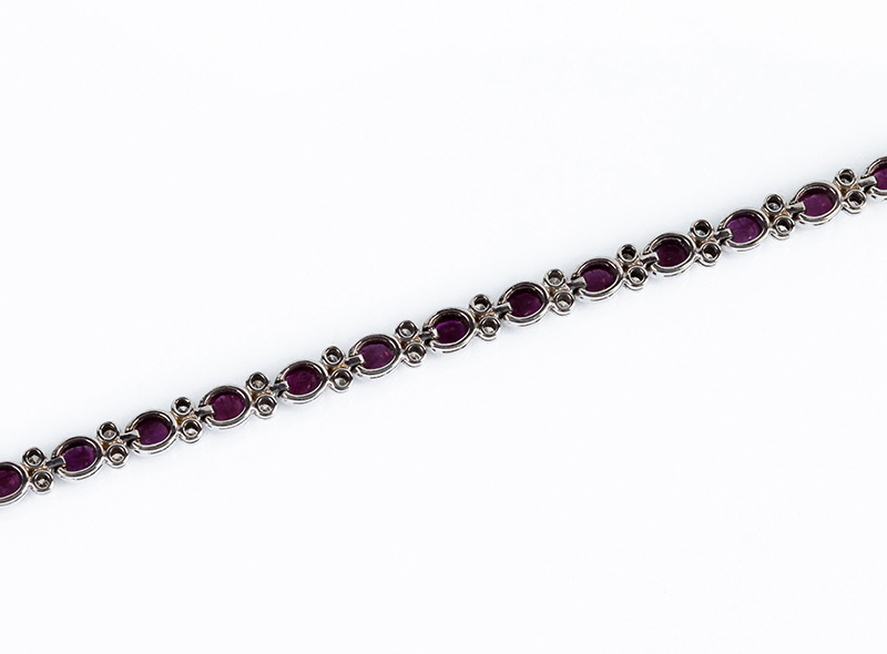 Pulsera riviere en sólida montura de oro blanco 18 K formada por fila articulada de rubíes finos, talla oval, alternados con pares de limpios y blancos diamantes, talla brillante, todos en chatón (20 rub: 11.00 ct aprox., y 40 bts:1.10 ct aprox., características estimadas: color H, pureza VS). Cierre y cadenita de seguridad. 18,7 cm.