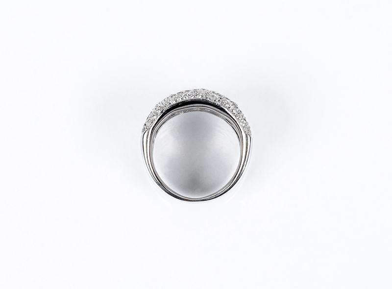 Elegante sortija en oro blanco 18 K, con frente curvado, con patrón geométrico grafilado, en pavé de limpios y blancos diamantes talla brillante (150 btes: 0.80 ct aprox., características estimadas: color H, pureza VS). Nº anillero: 10.