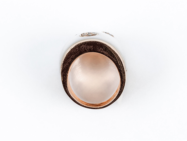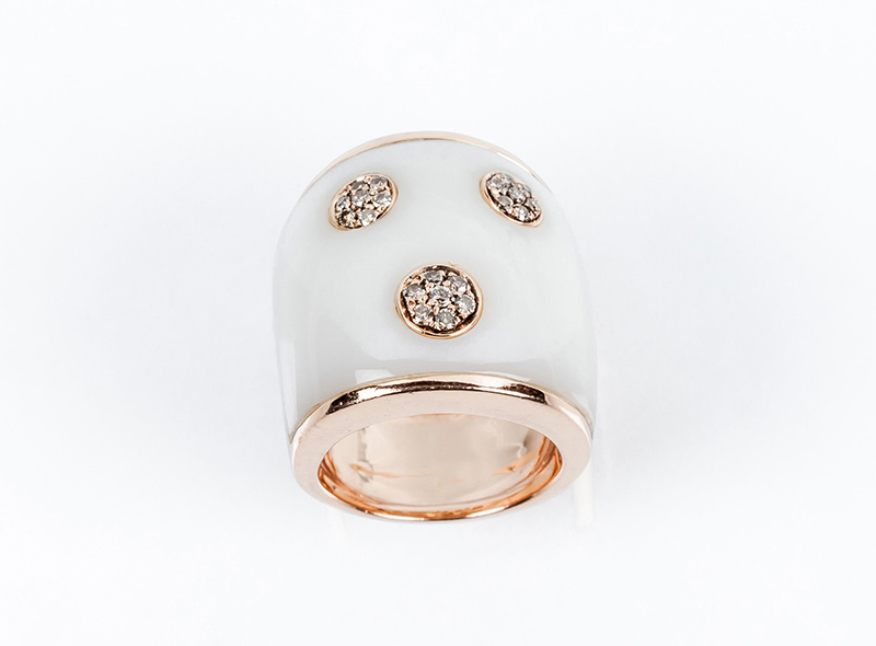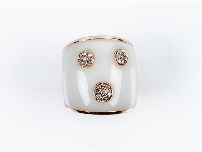 Elegante sortija ancha de alta joyería, en oro rosa 18 K, con frente de ágata blanca, decorado con tres motivos circulares en pavé de limpios diamantes, talla brillante, color champán (21 btes: 0.28 ct aprox.). Nº anillero: 14-15.