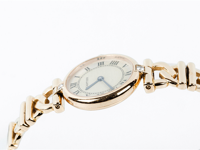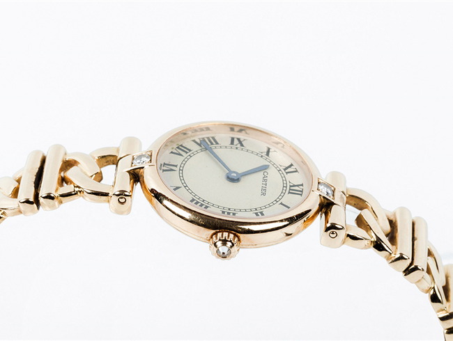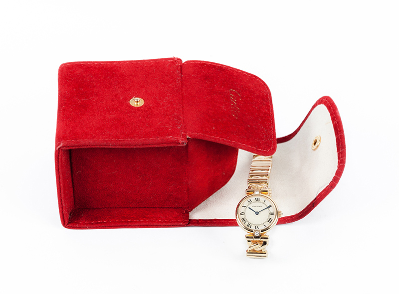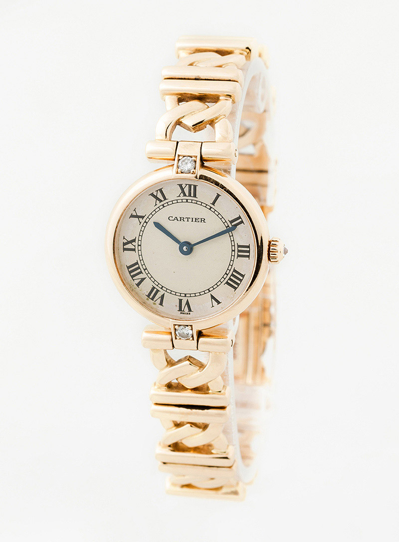 Reloj sra., suizo, CARTIER Vendôme, ref. 1068, en caja circular, 28 mm, decorada con un limpio y blanco diamante, talla brillante, sobre las 12 y otro bajo las 6, en chatón cuadrado, y brazalete articulado con cierre desplegable, todo en en oro amarillo 18 K. Corona engastada con un diamante invertido. Movimiento de cuarzo. Esfera crema con numerales romanos y agujas negras. Excelente condición (0-1). Estado de marcha. 17,3 cm. Con certificado de garantía 1994 y funda-estuche de piel y terciopelo.