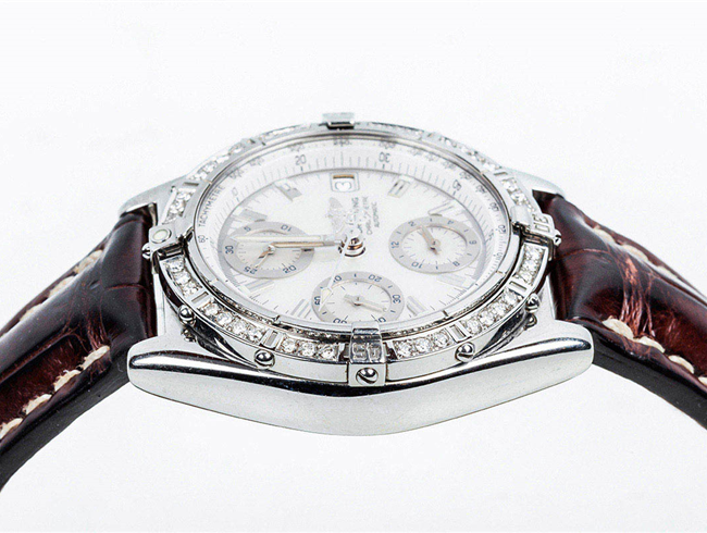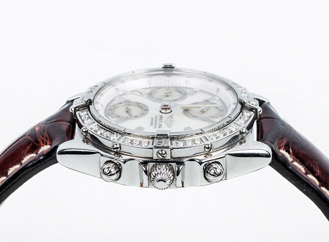 Reloj cronógrafo cab-unisex. suizo BREITLING, 'Chronomat Evolution', Cronómetro certificado, ref. A13352 en caja de acero 39 mm (nº 549115) con coronas roscadas y bisel giratotrio cuajado de limpios y blancos diamantes, talla brillante. Escala taquimétrica interior. Esfera de nácar natural con tres subdiales. Movimiento mecánico automático, calibre Breitling 13 (ETA Valjoux 7750 modificado). 25 Rubíes, 28.800 A/h, reserva de marcha ~42 horas. Certificado COSC. Calendario a las 3. Pulsera de piel de cocodrilo y hebilla originales. C. 2004. Excelente condición (0-1). Se acompaña de manual, documentación y estuche.