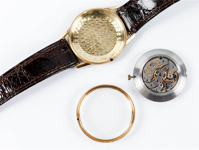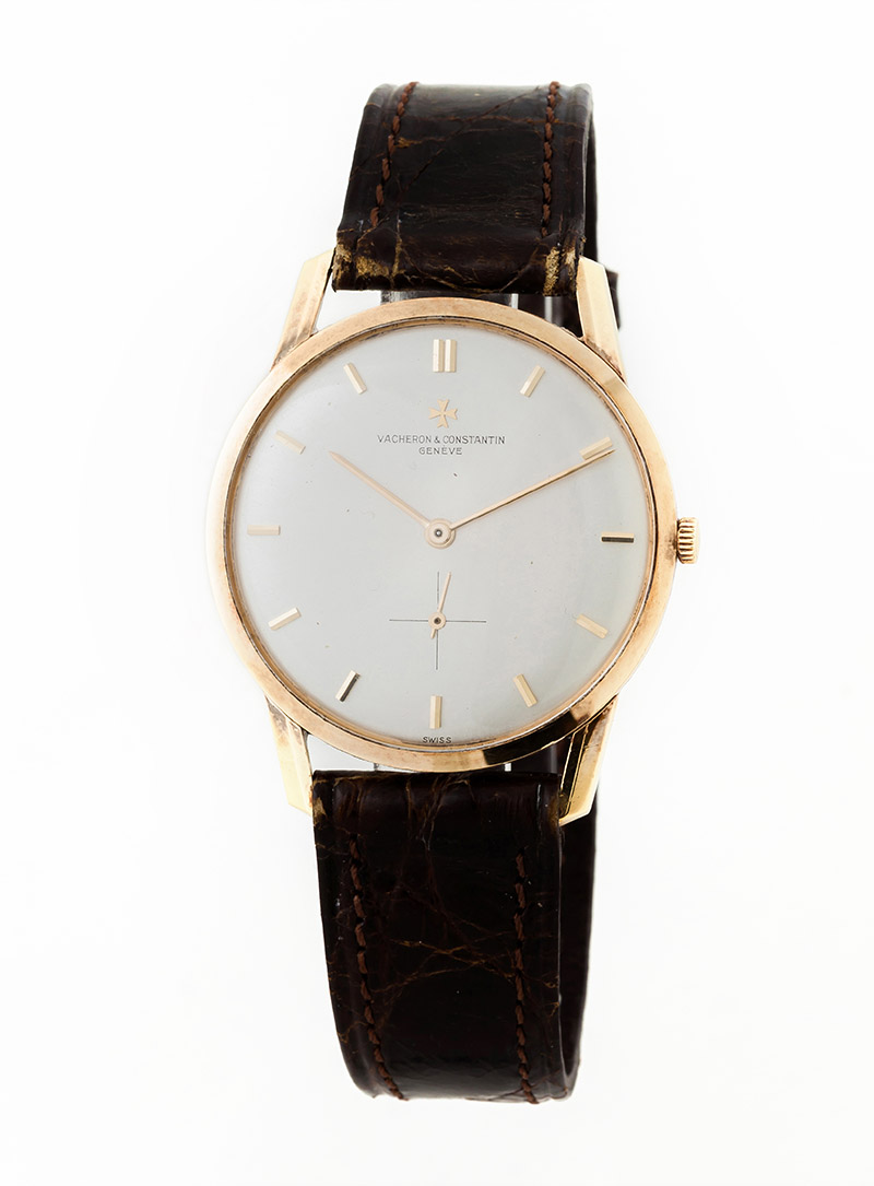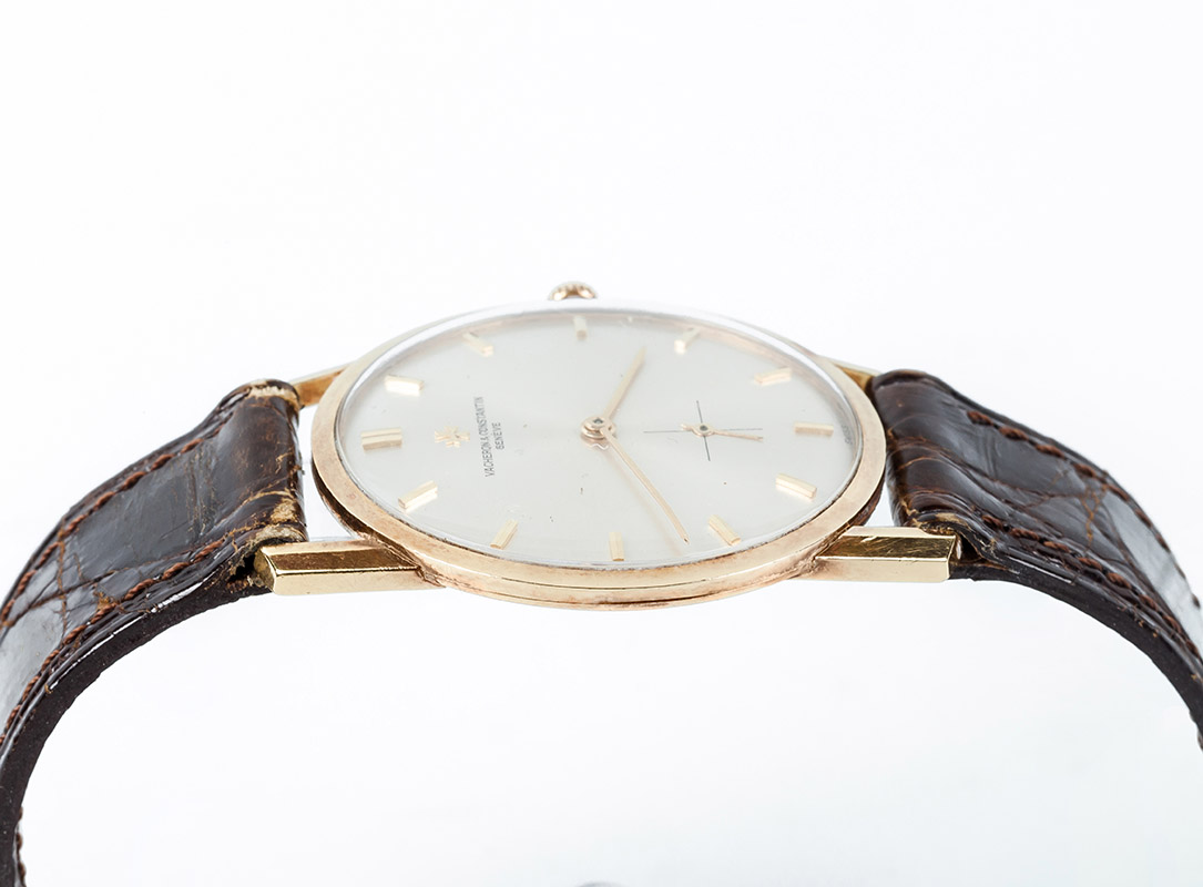 Reloj vintage suizo, caballero, VACHERON CONSTANTIN, dress watch ref.: 6456 B, en caja circular de origen, 34 mm, en oro amarillo 18 K, extraplana. Movimiento mecánico de carga manual calibre K1001/1 [Fabricado en colaboración con Jaeger-LeCoultre y refinada por Vacheron], nº 592550, con el punzón de Ginebra en el puente. 18 Rubíes, 5 posiciones de ajuste. Esfera plateada con baquetones y agujas doradas. Segundero a las seis. Brazalete de cocodrilo con hebilla de oro amarillo 18 K. C 1960. Excelente condición (1). Estado de marcha.