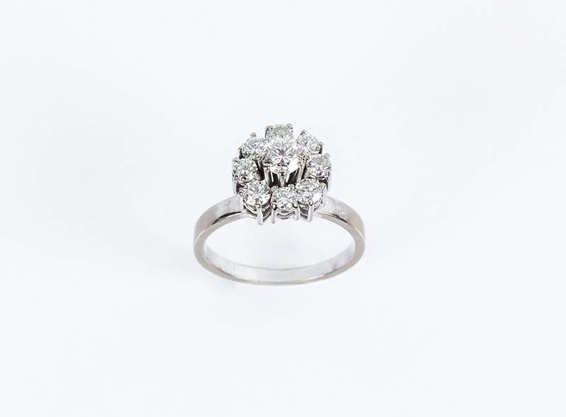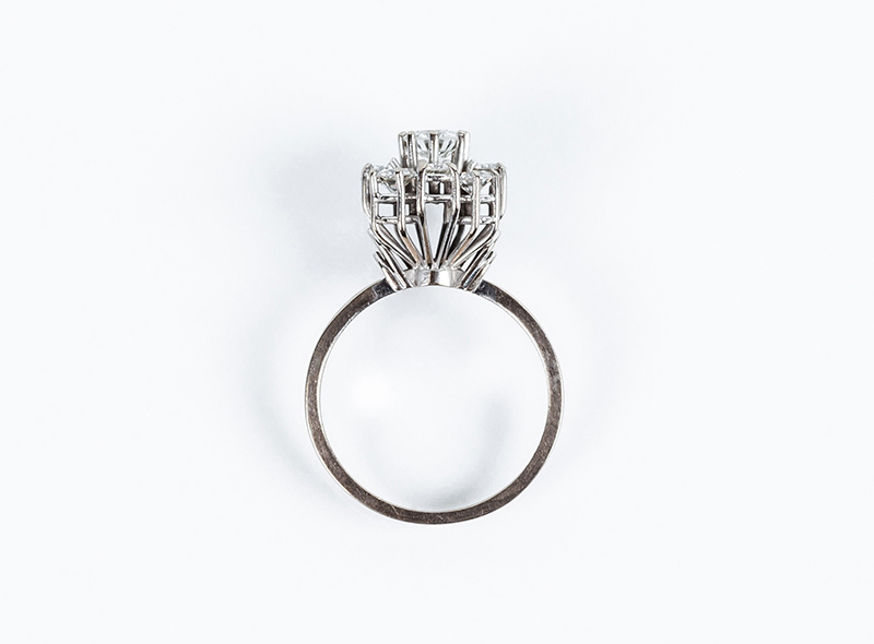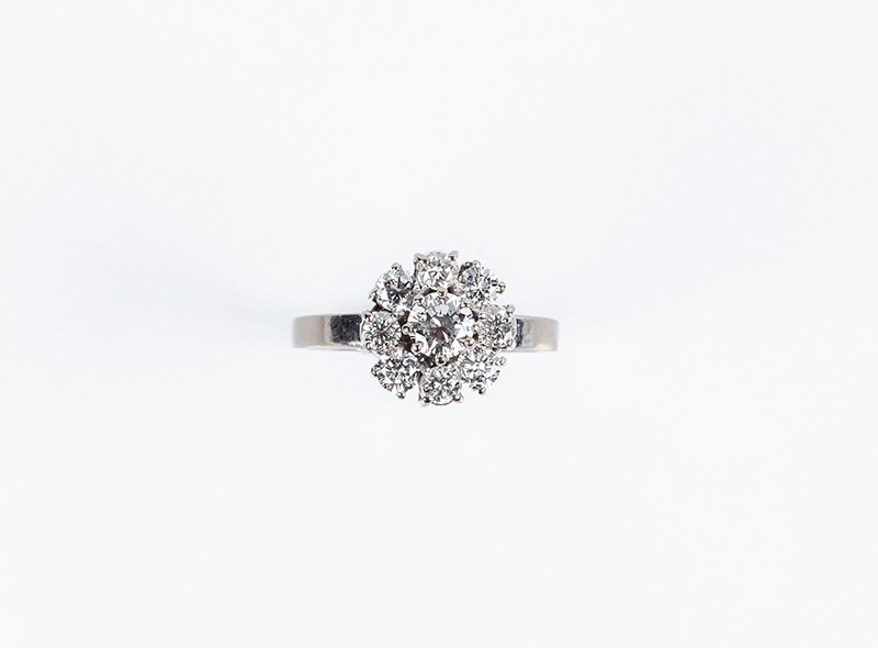Sortija vintage en montura de oro blanco 18 K, con motivo elevado en rosetón de limpios y blancos diamantes, talla brillante, en garras, destacando el central (1 bte: 0.35 ct aprox., características estimadas: color H, pureza VS y 8 bts: 0.60 ct aprox., características estimadas: color H-K, pureza VS). Anillero nº 14-15.