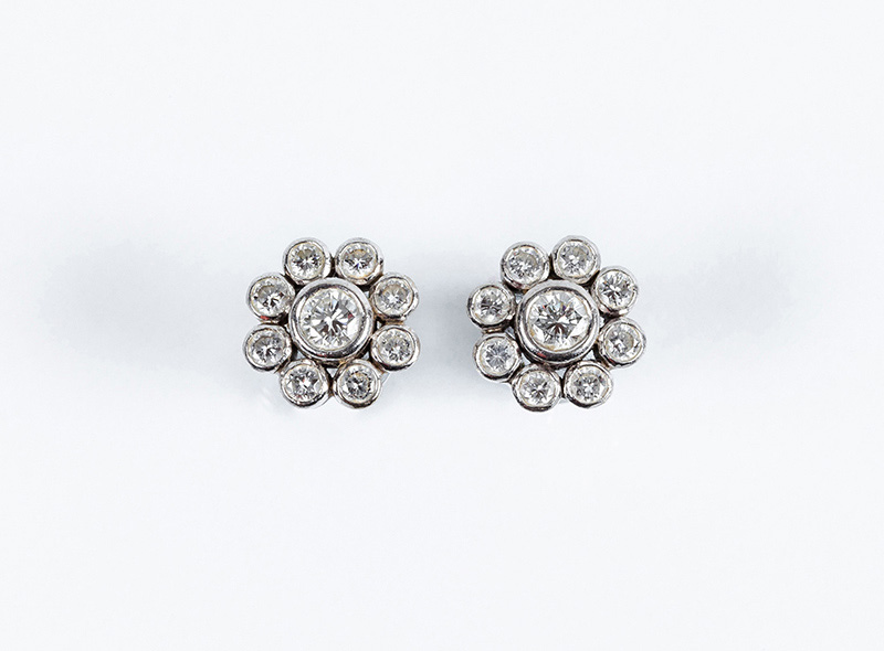 Pendientes vintage, en sólida montura de platino u oro blanco 18 K, con rosetón formado por un limpio y blanco diamante central, talla brillante, orlado de brillantes de menor tamaño, en chatón (2 bts: 0.80 ct aprox., y 16 bts: 1.40 ct aprox. Características estimadas: color G, pureza VS-VVS). Presiones de silicona. Diámetro: 14 mm.