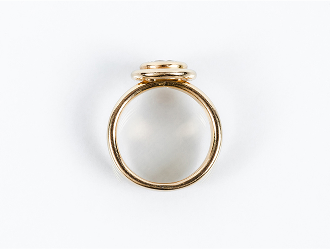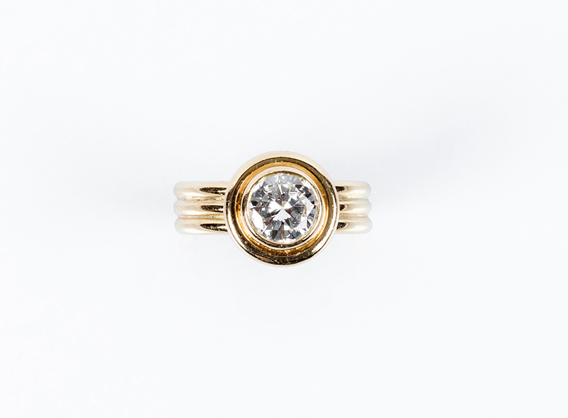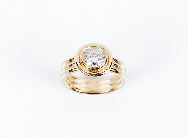 Anillo solitario en sólida montura de oro amarillo 18 K con un limpio y blanco diamante natural, talla brillante, en chatón (1 bte: 1.80 ct aprox., características estimadas: color G, pureza VS, muy buena talla, pulido y simetría, sin fluorescencia). Nº de anillero: 18.