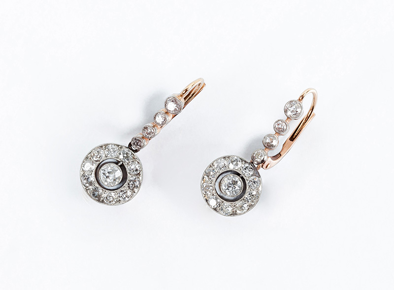 Bellos pendientes largos, antiguos, en oro rosa 18 K y limpios y blancos diamantes, talla brillante y 8/8 antigua, formando una fila de, en disminución, y motivo en movimiento, en aro calado con centro colgante (50 bts y dts: 1.80 ct aprox., características estimadas: color G-H, pureza VS-SI). Sistema de zarcillo con muelle.. 26 mm.Se acompaña estuche antiguo en piel azul, seda y terciopelo.