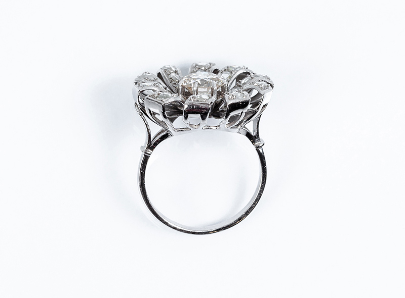 Bella sortija vintage en forma de flor, en platino, con un limpio y blanco diamante natural central, talla brillante, orlado en 'pétalos' cuajados de diamantitos talla rosa en decoración grafilada (1 bte: 1.30 ct aprox., características estimadas: color K, pureza VVS, muy buena talla, pulido y simetría, fluorescencia fuerte; 30 dts: 1.20 ct aprox. Características estimadas: color G-H, pureza VS). Nº de anillero: 18.