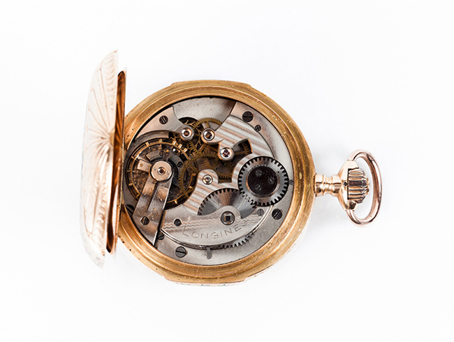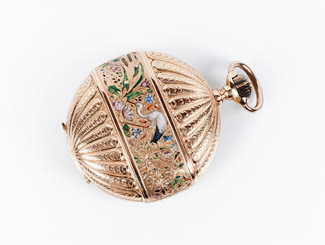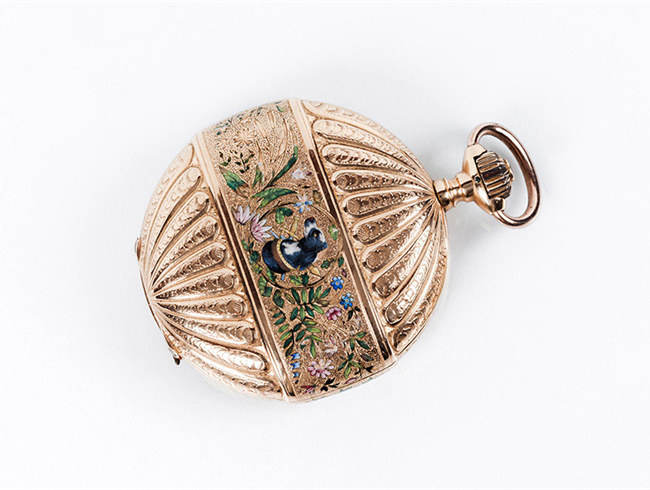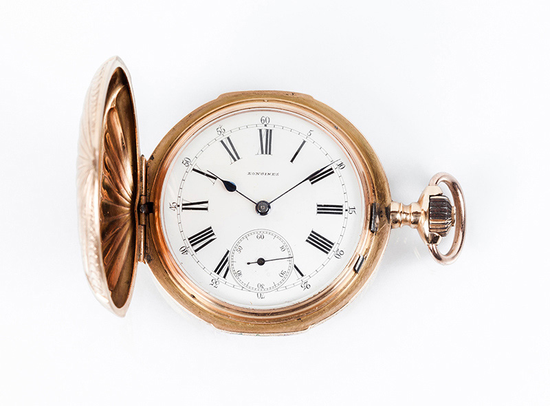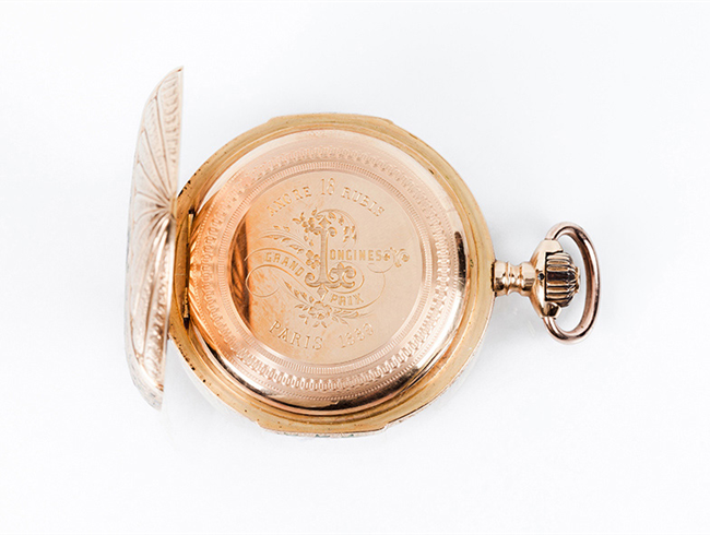 Reloj saboneta de bolsillo, suizo, LONGINES, en una bella caja de origen, 53 mm, de tres fuertes tapas, en oro amarillo 18 K, las principales en relieves de concha con una franja central profusamente ornada con delicados motivos animales y vegetales en policromía esmaltada, Nº 515491, y la guardapolvos con el lema de Grand Prix 1889 para la firma y las características del movimiento: áncora, 18 rubíes, en orla grabada. Excelente movimiento remontoir con volante bi-metal compensado, rubíes. Esfera de porcelana blanca con numeración romana negra y agujas 'espada' en acero azul. Segundero a las seis. C. 1895. Impecable condición (0-1). Estado de marcha. [Esta pieza pertenece al período de oro de Longines tras su éxito en la Exposición Universal de París 1889 (Grand Prix), donde Ernest Francillon posicionó la marca como referente en cronometría de precisión y alta complicación. Los relojes con decoración esmaltada policroma y naturalista eran encargos especiales para clientes adinerados