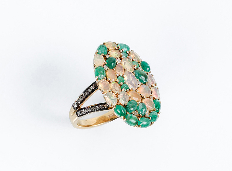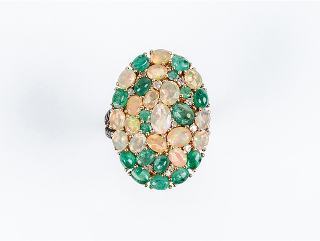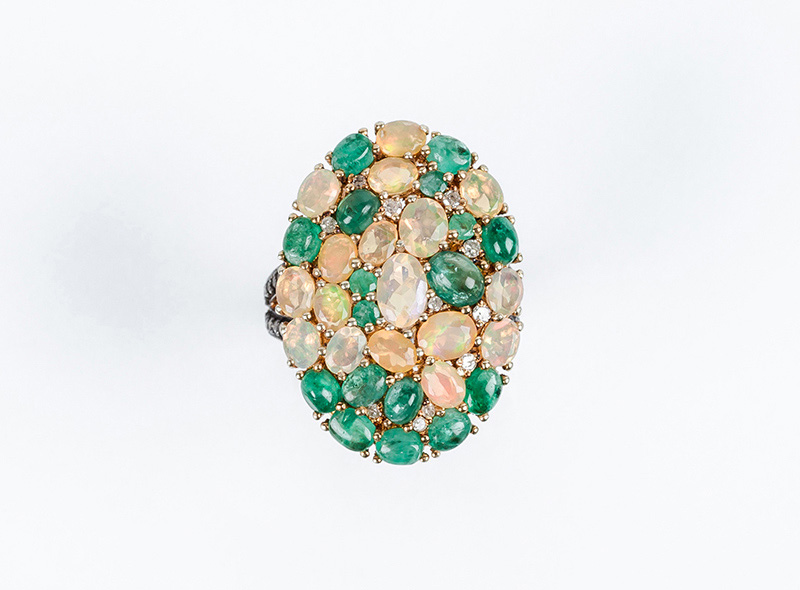 Bella sortija lanzadera en oro amarillo 18 K, con motivo oval cuajado en pavé de esmeraldas naturales y ópalos, talla oval y en cabuchón, salteados con blancos diamantitos talla 8/8, en vistas de plata sobredorada. Hombros decorados en filas de diamantitos sobre vistas pavonadas (32 Esm y op: 5.22 ct y 41 dts: 0.32 ct, características estimadas: color H-K, pureza I). Anillero nº 14-15.