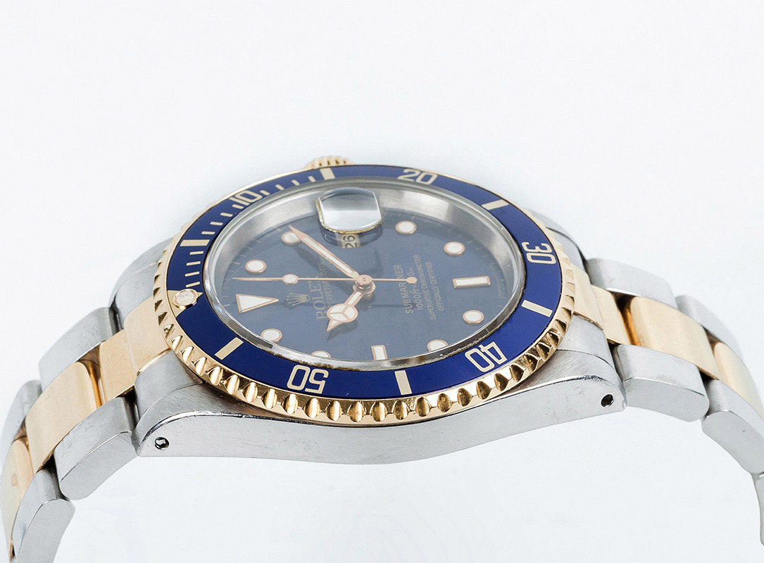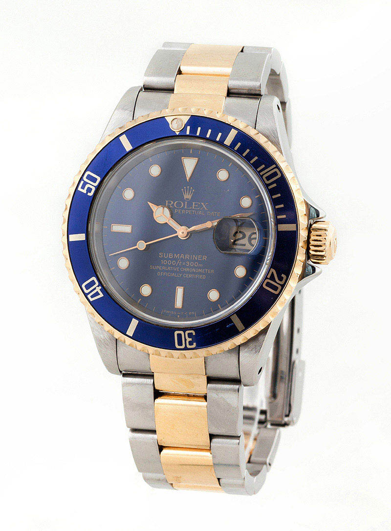 Reloj cab., suizo ROLEX Oyster Perpetual Date Submariner, 1000 m/300 ft, cronómetro oficial certificado, ref 16800. Caja 40 mm, con bisel azul con punto de tritio, y brazalete de acero y oro original 'President'. Movimiento automático. Esfera azul con puntos, baquetones y agujas dorados y luminiscentes, segundero central. Calendario a las tres, con lupa. C 2004. Muy buena condición (1-2). Estado de marcha.