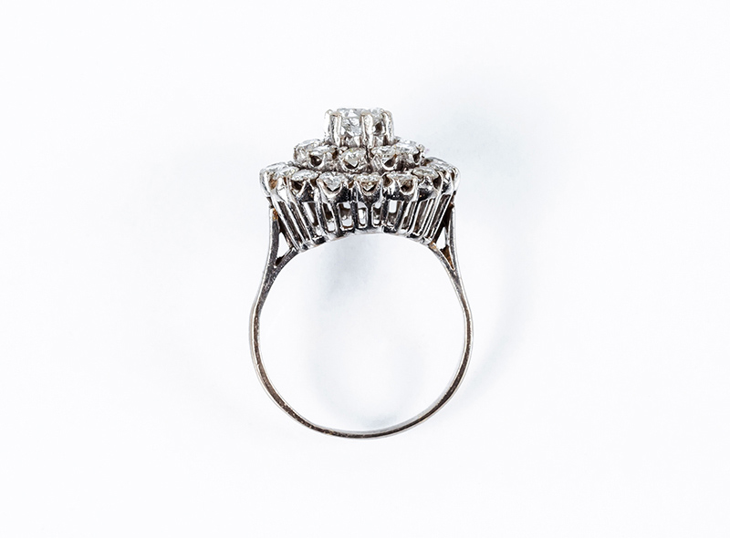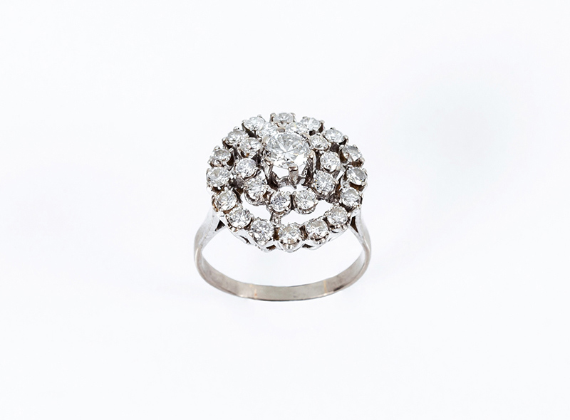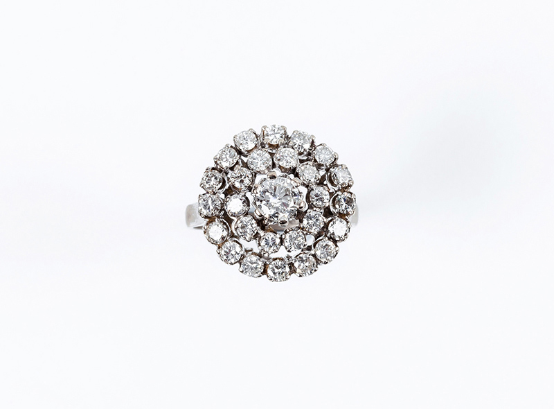 Bella sortija vintage en oro blanco con un gran rosetón doble orla escalonada de limpios y blancos diamantes, talla brillante, en garritas sobre copa calada (1 bte: 0.50 ct aprox., características estimadas: color I, pureza SI y 26 bts: 1.40 ct aprox. Características estimadas: color H, pureza VS-SI). Nº de anillero: 20.