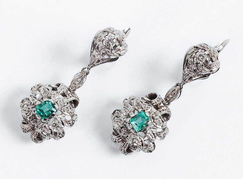 Pendientes antiguos, largos, en oro blanco 18 K, formados por dos cuerpos calados, en movimiento: un limpio y blanco diamante, talla brillante, en el superior, en garritas, y una bella esmeralda, en su talla, en el inferior, todo en bandas sinuosas con decoración grafilada (2 esm: 0.80 ct, 2 bts: 0.20 ct, características estimadas: color H, pureza VS). C. 1950. Sistema catalán. 40 mm.