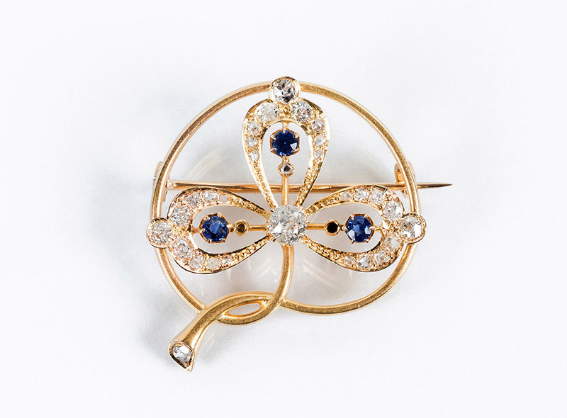 Bello alfiler de autor, época modernista, en sólida montura de oro amarillo 18 K, con motivo de trébol con un limpio y blanco diamante central, talla brillante antigua, diamantitos y zafiros azules. (1 bte: 0.25 ct, características estimadas: color G, pureza SI, y 31 dts: 0.46 ct aprox. -faltan 3-). 32 x 30 mm.