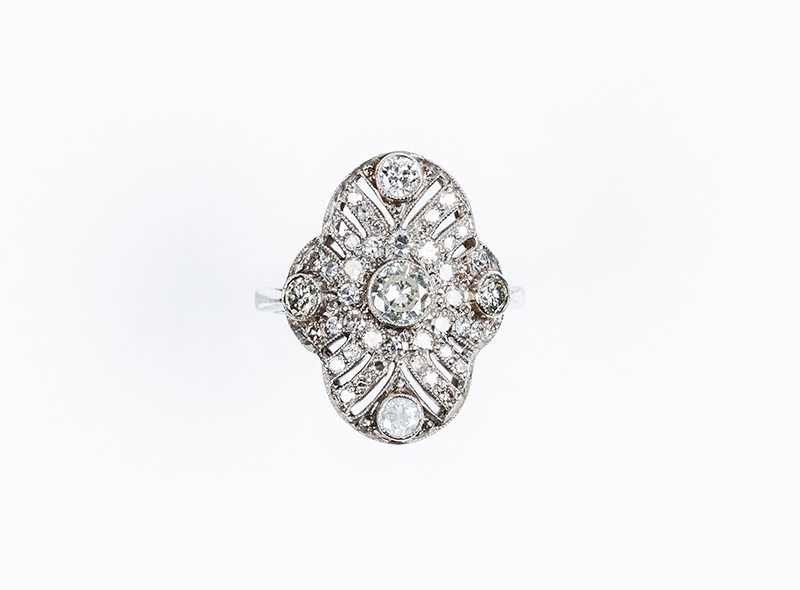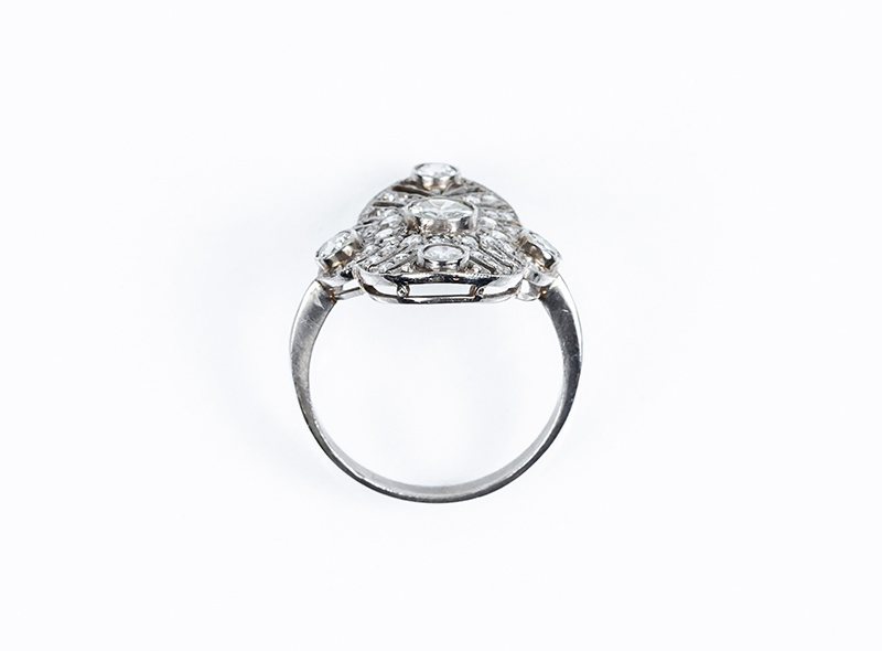 Bella sortija lanzadera art-decó en platino cuajada de limpios y blancos diamantes, talla brillante y 8/8. Tiene un brillante central y cuatro centros periféricos en chatón, sobre patrón calado, oval, en decoración grafilada (1 bte: 0.40 ct, 4 bts: 0.50 ct aprox., características estimadas: color K, pureza VS; 44 dts: 0.90 ct aprox. Características estimadas: color H-J, pureza VS-SI). Nº de anillero: 18.