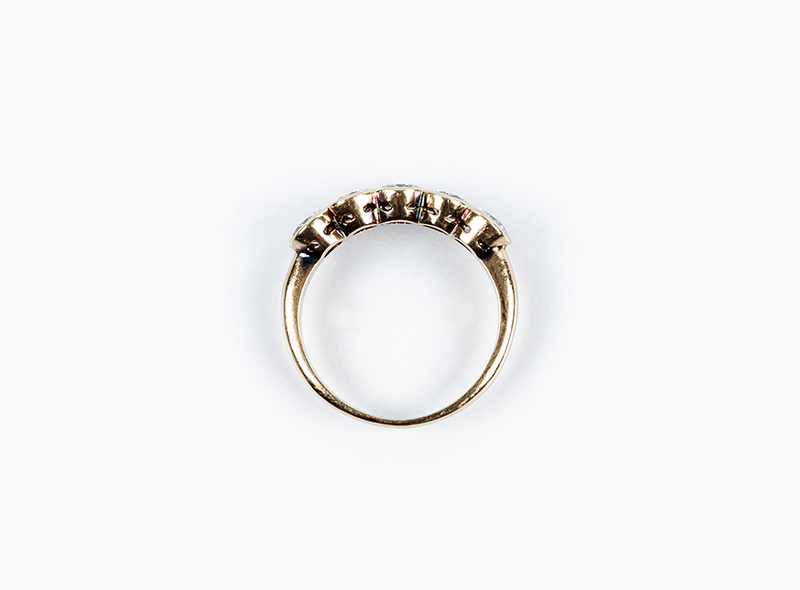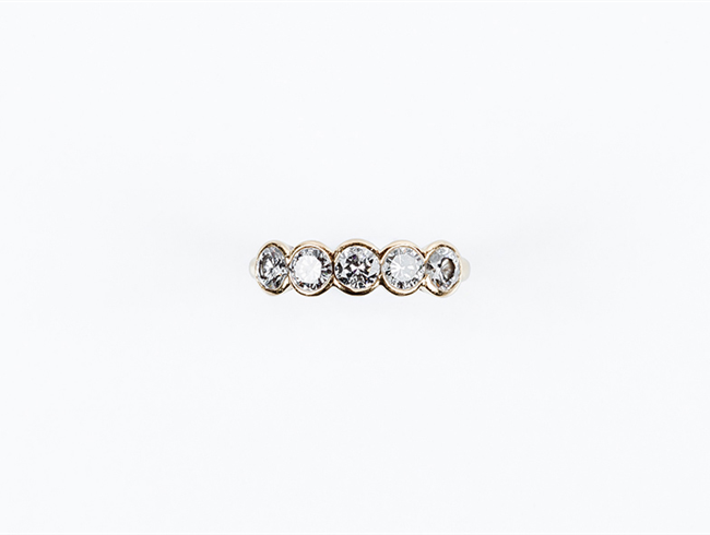 Anillo media alianza en oro amarillo 18 K, con frente en fila de limpios y blancos diamantes talla brillante (5 btes: 1.20 ct aprox., características estimadas: color H, pureza VS), en chatón. Nº anillero: 13.