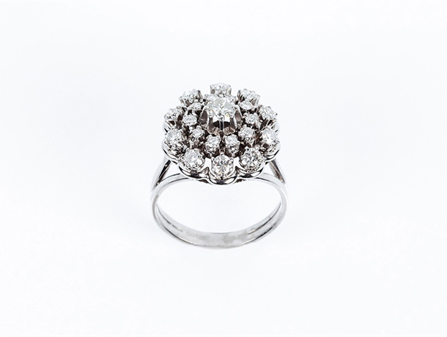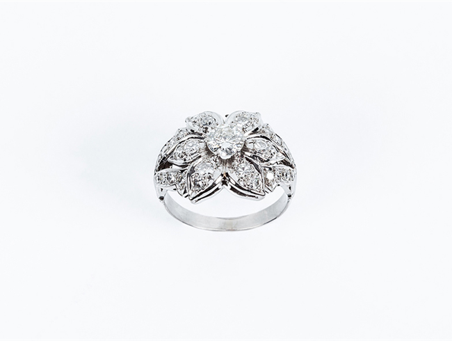 Bella sortija en rosetón calado de oro blanco, en cúpul...