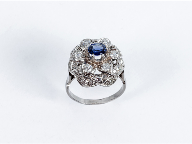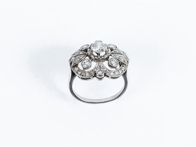 Bella sortija vintage en platino, con un limpio y blanc...
