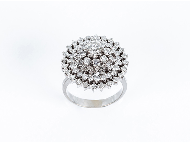 Sortija en oro blanco con motivo de gran rosetón de dia...
