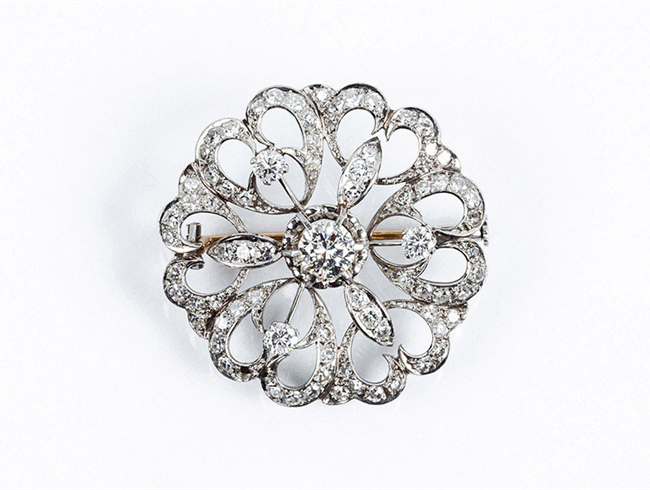 Alfiler vintage en oro blanco con motivo de rosetón cal...