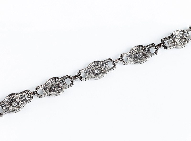 Bello brazalete antiguo, época 'art-decó', en platino, formado por eslabones ovales, con un limpio y blanco diamante central, talla brillante, en chatón, sobre motivo geométrico calado cuajado de diamantitos talla 8/8, en vistas grafiladas (5 bts: 1.20 ct aprox., características estimadas: color H, pureza VS y 180 dts: 4.00 ct aprox., características estimadas: color H, pureza VS). Ciere y cadenita de seguridad. 15,6 cm.
