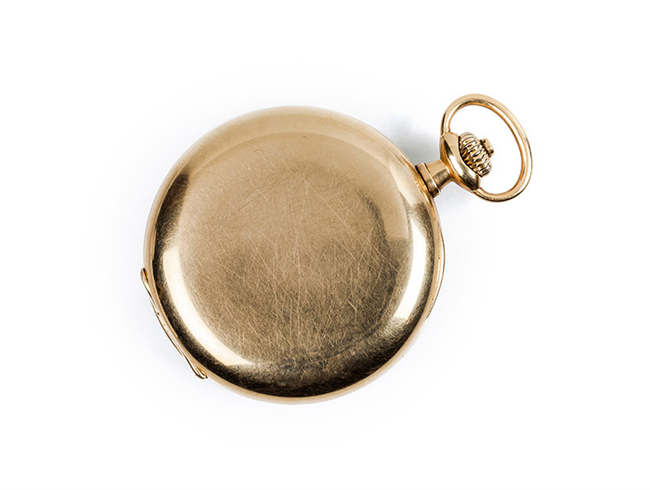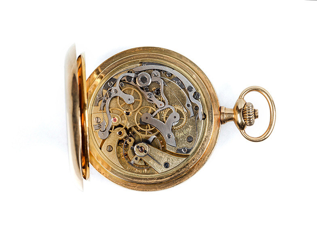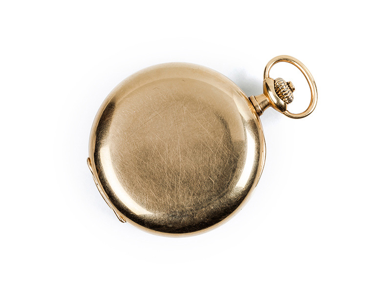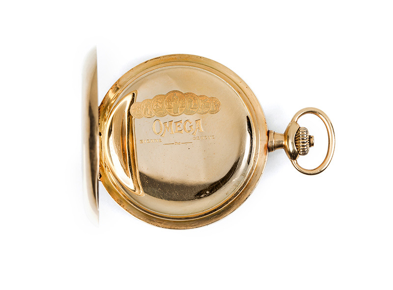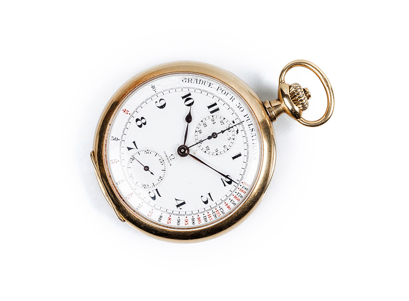 Reloj cronógrafo médico suizo, tipo lepine, OMEGA, en sólida caja de oro amarillo 18 K, 50 mm, de dos fuertes tapas lisas, la guardapolvos decorada con medallas de la firma. Excelente movimiento nº 5369077, escape de áncora, rubíes, volante bimetal compensado, remontoir. Esfera de porcelana con escala médica de 30 pulsaciones en rojo y negro. Numerales arábigos y agujas en negro. Contador de minutos a las 12. Segundero a las seis. Pulsador cronógrafo en la corona. Año de fabricación: 1916. Muy buena condición (1). Estado de marcha.