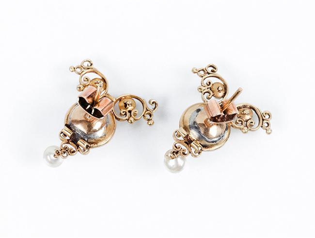 Pendientes antiguos en filigrana de oro amarillo 20 K, con un rosetón calado y perlita colgante, decorados con perlitas aljófar. S XVIII.Sistemas de presión en oro 18 K. 27 x 20 mm.