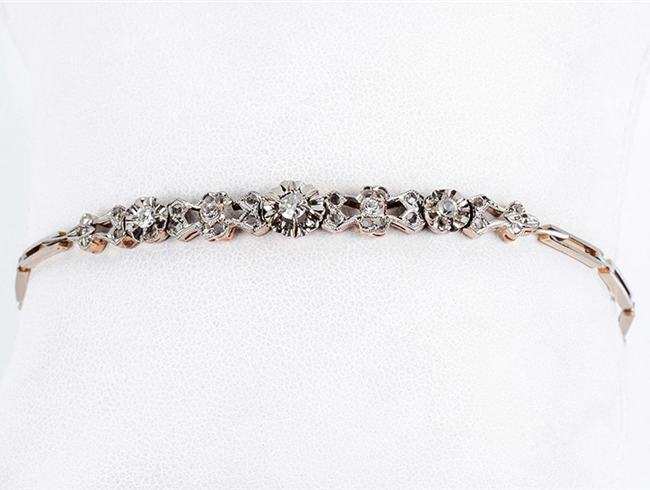 Pulserita antigua en delicada montura de oro rosa 18 K con vistas grafiladas de platino y tres centros de diamantes, talla 'cojín', en garritas de ilusión, sobre motivo geométrico calado decorado con diamantitos talla 8/8 y simple (3 bts: 0.22 ct aprox., y 28 dts: 0.20 ct aprox., características estimadas: color H-I, pureza VS-SI). Cierre y cadenita de seguridad. 19,4 cm.