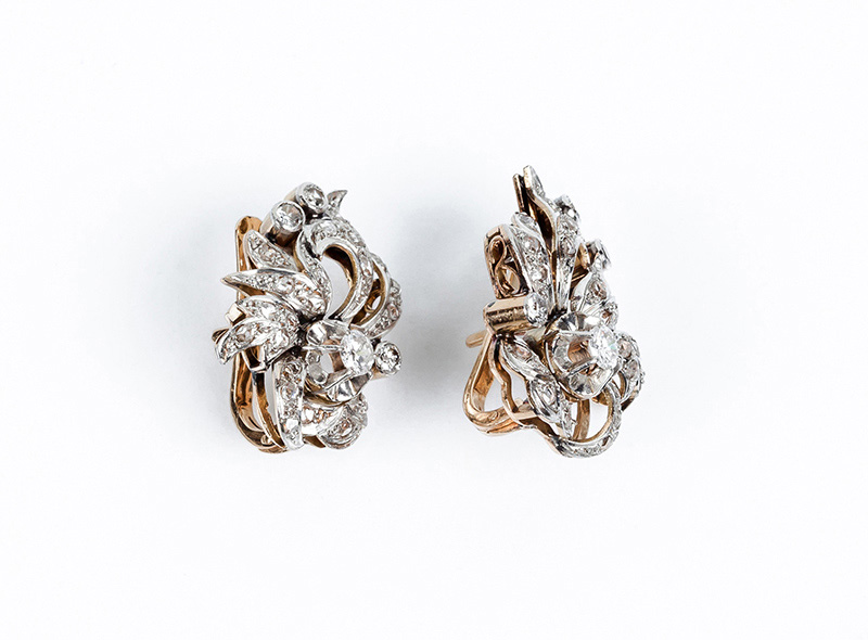 Bellos pendientes vintage de época, en montura de oro rosa 18 K, con un limpio y blanco diamante central, talla brillante, en garras de ilusión, sobre motivo en ramo calado decorado con brillantitos en chatón y diamantitos simples, en vistas de oro blanco (2 bts: 0.44 ct aprox., características estimadas: color H, pureza VS; 6 bts 0.30 ct y 40 dts: 0.40 ct aprox. 80 dts: 0.80 ct aprox.). Sistema clip. 25 x 19 mm.