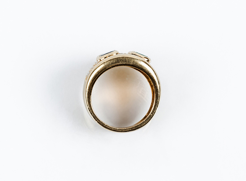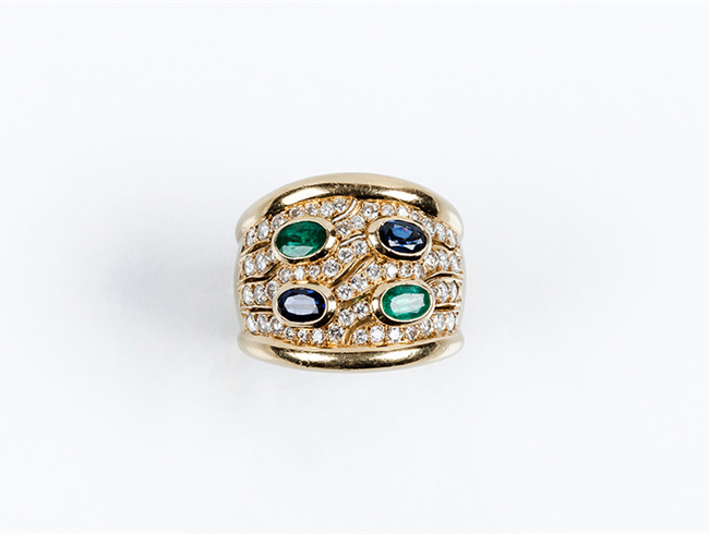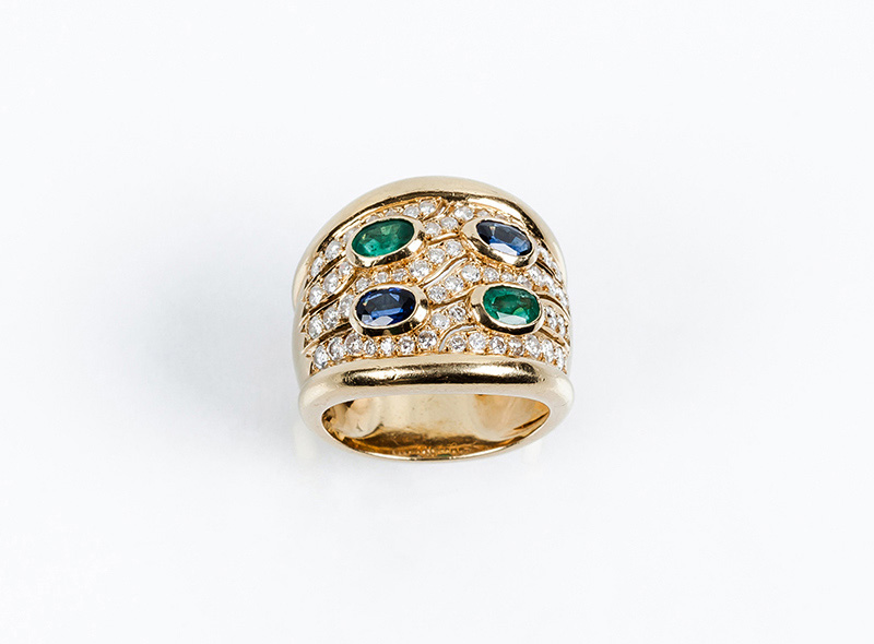 Sortija ancha en sólida montura de oro amarillo 18 K, con zafiros finos azules y esmeraldas talla oval, sobre bandas sinuosas de limpios y blancos diamantes talla brillante (2 zaf: 0.80 ct, 2 esm: 0.90 ct aprox y 56 btes: 1.00 ct aprox., características estimadas: color H, pureza VS). Nº anillero: 14-15.