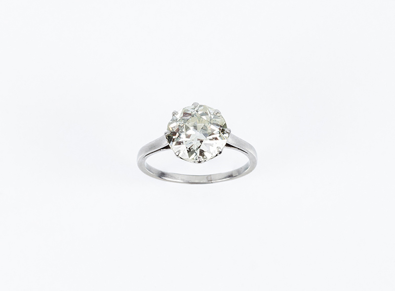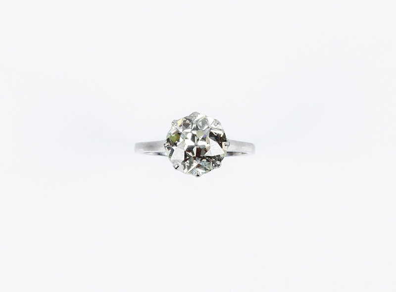 Anillo solitario antiguo, en montura de platino, con un limpio diamante, talla brillante antigua, montado en garritas sobre copa calada (1 bte: 2.65 ct aprox., características estimadas: color K, pureza VVS; sin fluorescencia). Nº de anillero: 12.