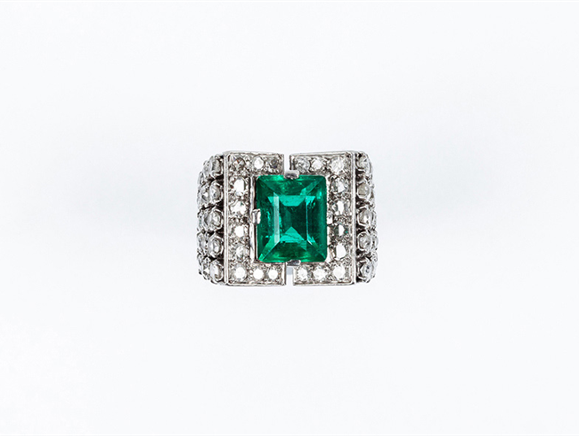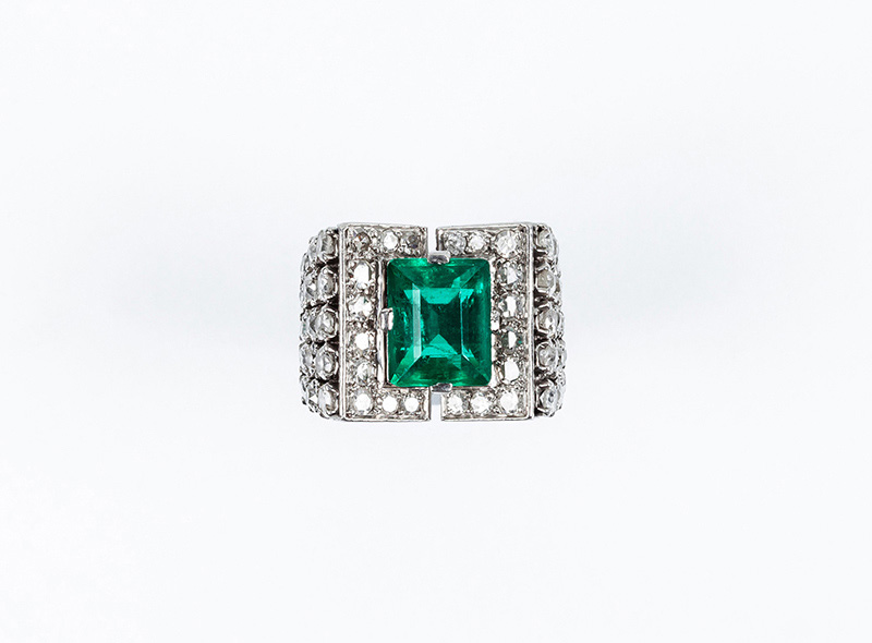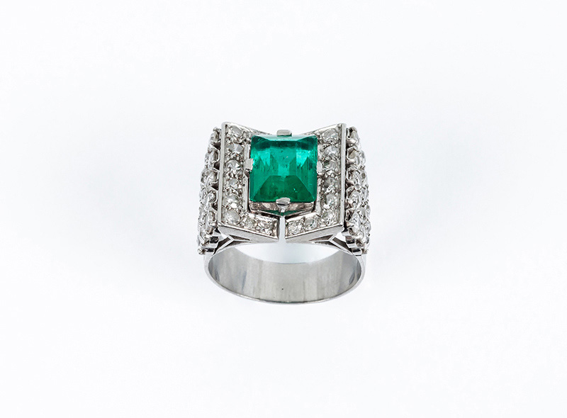 Sortija antigua en platino, estilo 'art-decó' con una piedra verde central, en su talla, orlada y flanqueada en tejadillo de limpios y blancos diamantes, talla brillante y 8/8, en garras, dispuestos en bandas (50 bts y dts: 1.90 ct aprox., características estimadas: color H, pureza VS). Nº de anillero: 12.