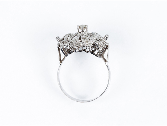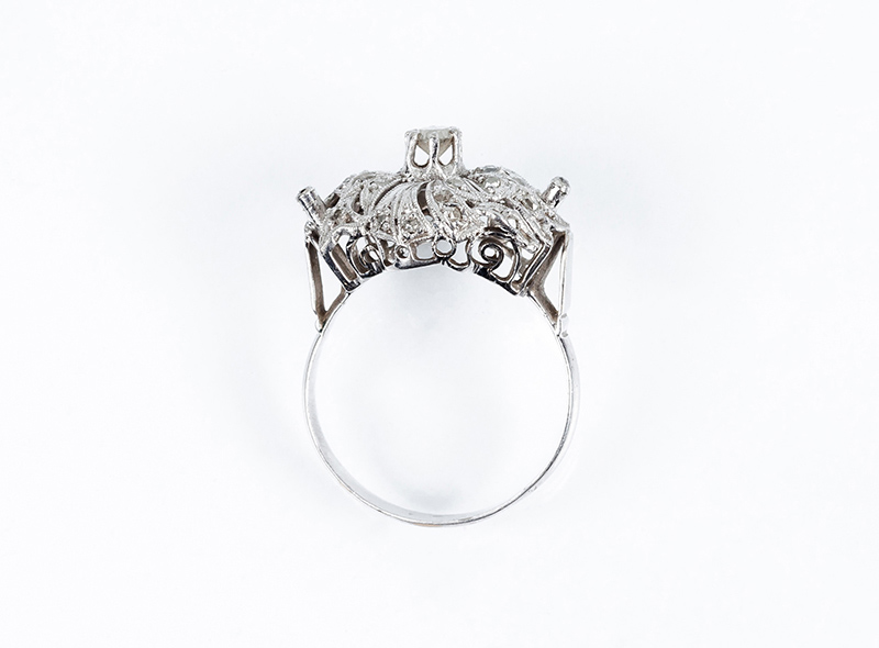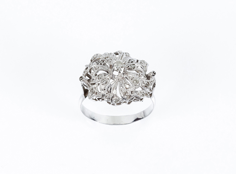 Sortija antigua en oro blanco 18 K con un limpio y blanco diamante central, talla brillante, en garras sobre motivo calado en bandas de diamantes simples y vistas grafiladas (1 bte: 0.20 ct aprox., características estimadas: color H, pureza I1; 24 dts: 0,20 ct aprox., ). Nº de anillero: 18.