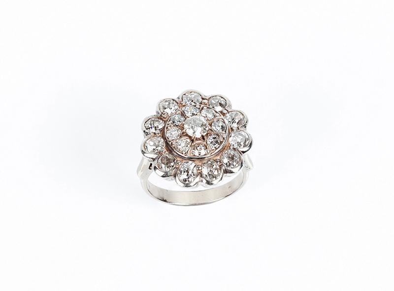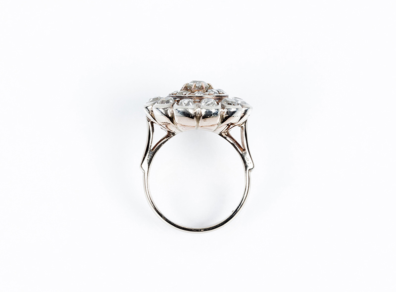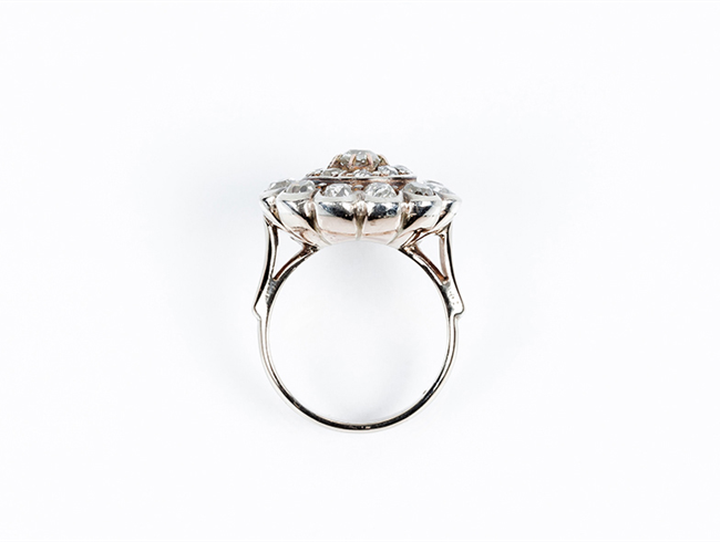 Espléndida sortija vintage en sólida montura de oro blanco 18 K, con motivo rosetón formado por centro y doble orla de limpios y blancos diamantes, talla brillante antigua y 'cojín' (1 bte: 0.25 ct y 19 bts: 2.80 ct aprox., características estimadas: color H-J, pureza VS-SI). Nº de anillero: 14-15.