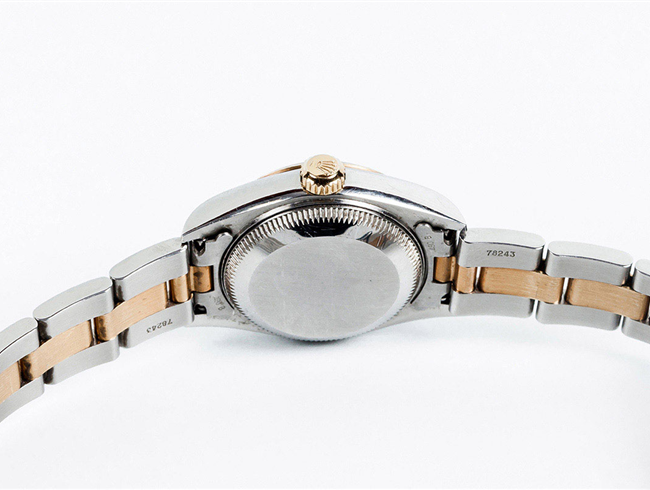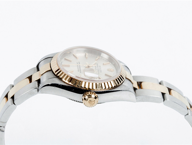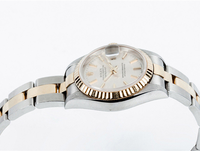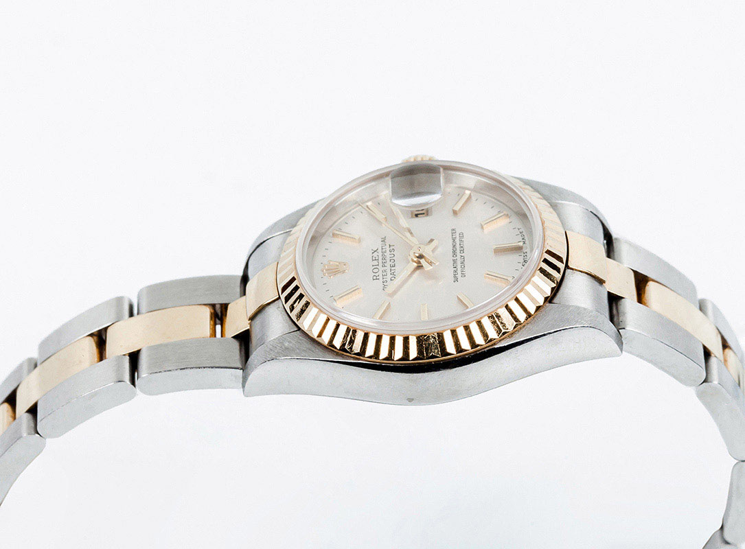 Reloj suizo sra. ROLEX, mod. Lady Oyster Perpetual Date Just, ref 79173 -cronómetro certificado. Caja 26 mm y brazalete en acero-oro. Movimiento automático. Esfera plateada con baquetones y agujas doradas. Segundero central. Calendario. Cristal zafiro. C. 2004. Excelente condición (1). Estado de marcha. Con su documentación, estuche, manual, etiqueta y sobre-caja.