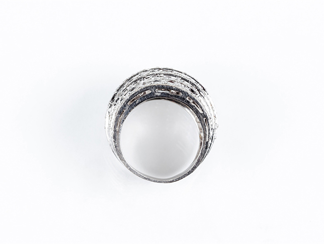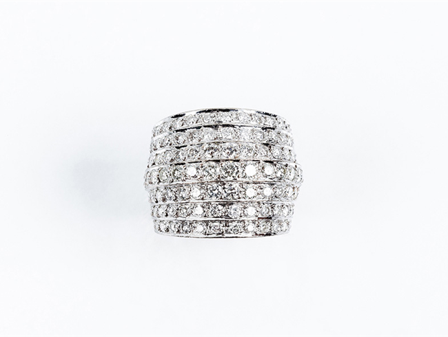Sortija ancha en sólida montura de oro blanco 18 K, diseño ligeramente 'bombé' en bandas escalonadas de limpios y blancos diamantes talla brillante (105 btes: 3.50 ct aprox., características estimadas: color G-H, pureza VS). Nº anillero: 11-12.