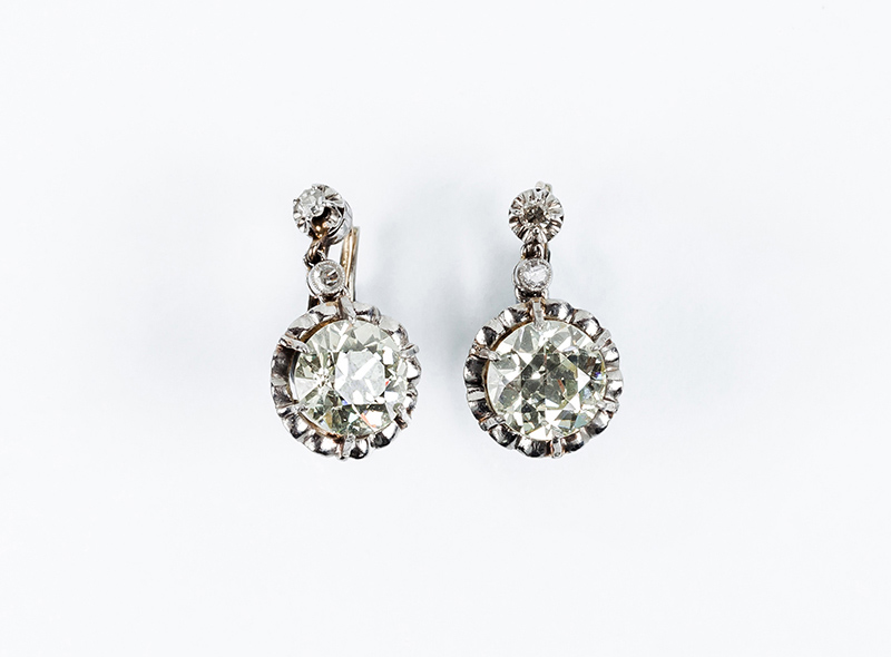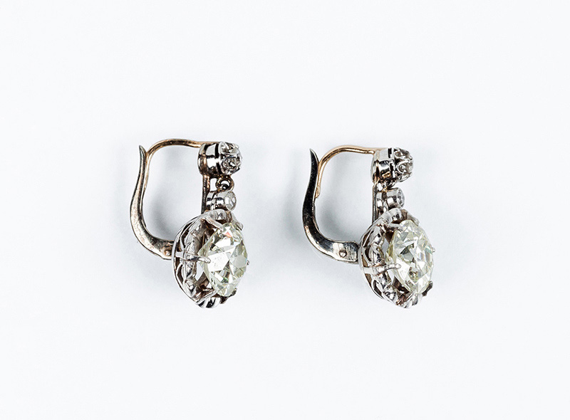 Bellos pendientes solitarios antiguos, en montura de platino y oro amarillo 18 K, con un limpio diamante, talla brillante antigua, en movimiento, montado en garritas de ilusión sobre copa calada. Sobre él dos diamantitos talla 8/8 en chatón grafilado y en garritas de ilusión (2 bts: 3.60 ct aprox., características estimadas: color M, pureza VVS; fluorescencia débil). Sistema de muelle. 19 mm.