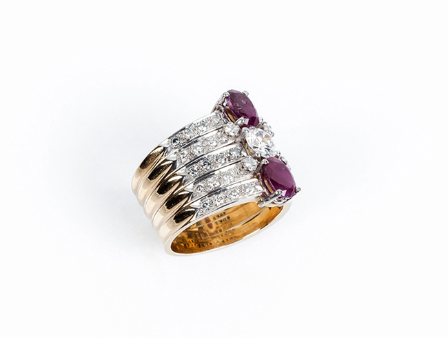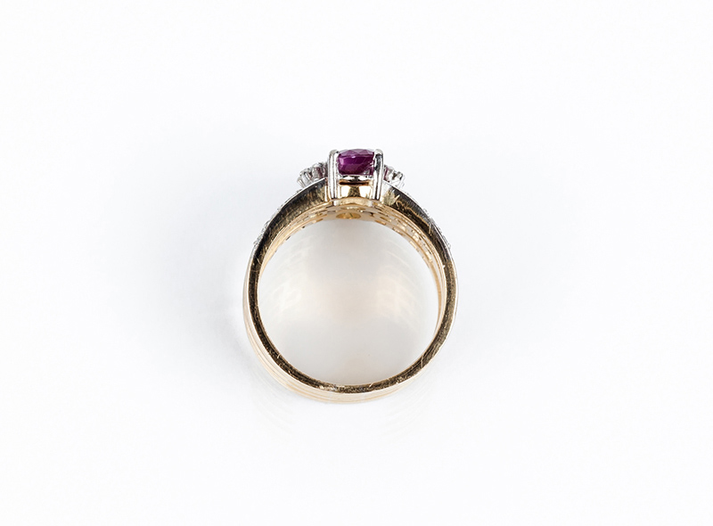 Espléndida sortija años 80, en sólida montura de oro amarillo 18 K, con un limpio y blanco diamante, talla brillante, central, flanqueado de dos rubíes finos talla oval, en garritas, sobre motivo en bandas curvas decoradas en fila de brillantitos y vistas de oro blanco (2 rub: 2.40 ct aprox.; 1 bte: 0.65 ct aprox., características estimadas: color H, pureza SI, y 40 dts: 0.60 ct aprox., características estimadas: color H, pureza VS). Nº de anillero: 16-17.